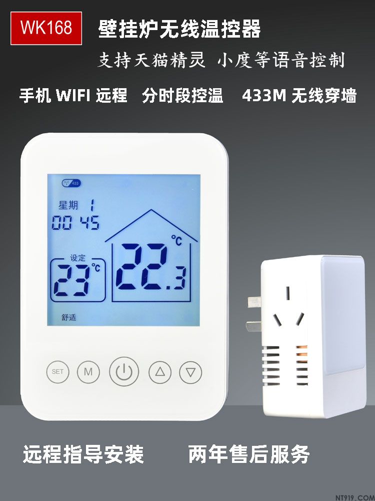 WK168无线温控器有两部分,插头式接收器和温控面板。插头式接收器插在炉子边上,与壁挂炉的温控接口相连,它自带电源插头,可用壁挂炉原有的电源插座,对插座少的客户来说很方便。温控面板放在客厅,与接收器通过433MHZ无线电波通讯,这种通讯方式一般可穿透两三道非承重墙,大部分民居都够用的了。